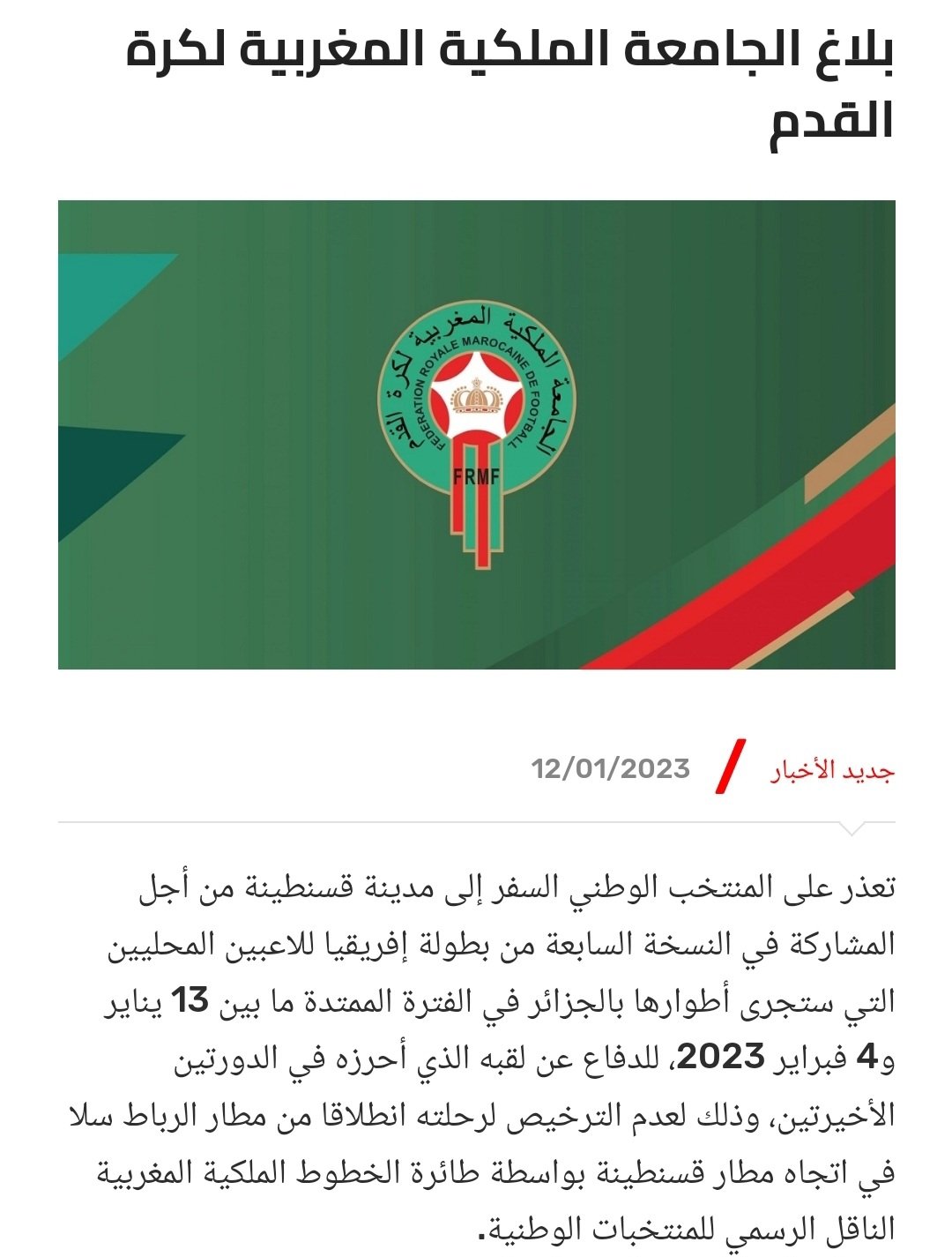 أعلنت الجامعة الملكية المغربية لكرة القدم، أنه تعذر على المنتخب المغربي السفر إلى مدينة قسنطينة من أجل المشاركة في النسخة السابعة من بطولة إفريقيا للاعبين المحليين التي تقام بالجزائر في الفترة ما بين 13 يناير و4 فبراير 2023 .