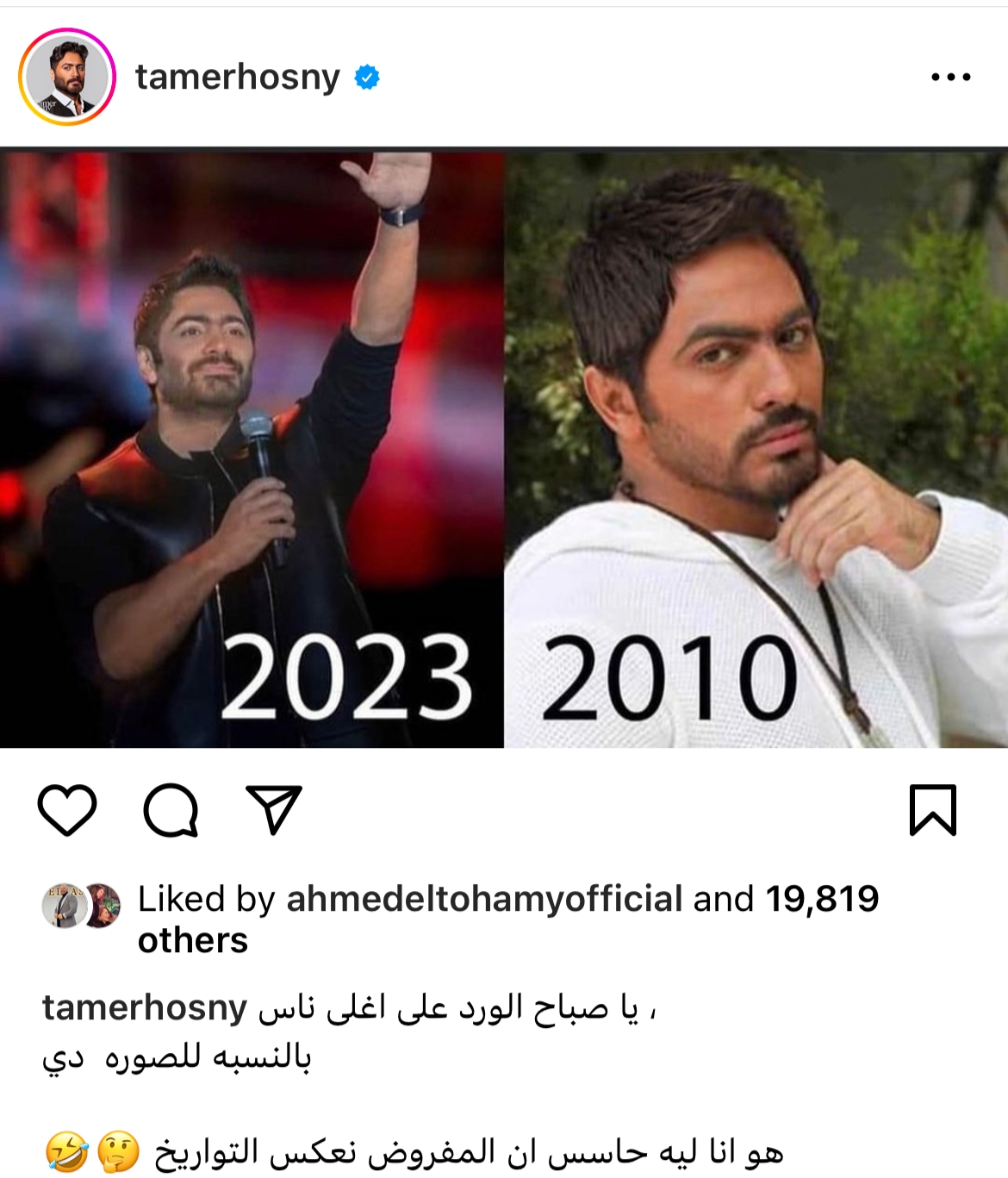 مازح الفنان تامر حسني متابعيه بالمقارنة بين صورتين له، إحداهما بعام 2010 والأخرى عام 2023 وذلك عبر حسابه بموقع تبادل الصور والفيدويوهات “انستجرام”.