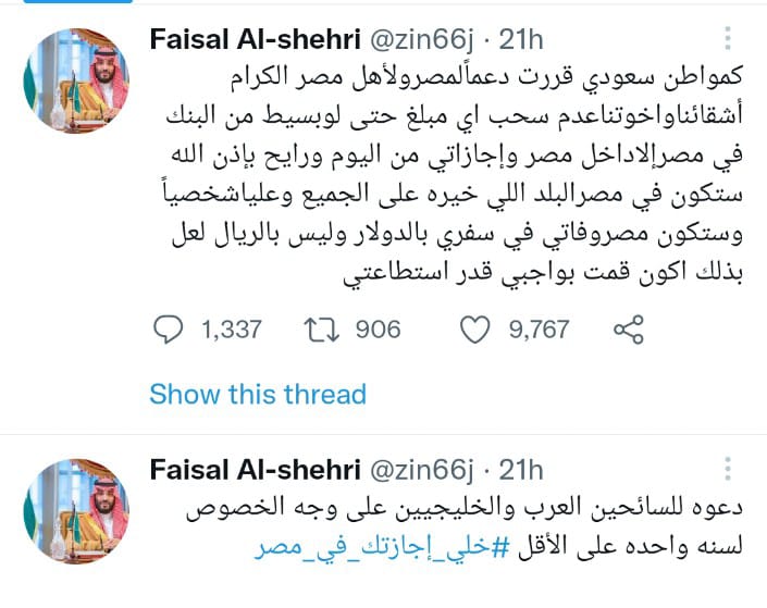 وقال ،"كمواطن سعودي قررت دعماً لمصر ولأهل مصر الكرام أشقائنا واخوتناعدم سحب اي مبلغ حتى لوبسيط من البنك في مصر إلاداخل مصر وإجازاتي من اليوم ورايح بإذن الله ستكون في مصرالبلد اللي خيره على الجميع وعليا شخصياً وستكون مصروفاتي في سفري بالدولار وليس بالريال لعل بذلك اكون قمت بواجبي قدر استطاعتي".
