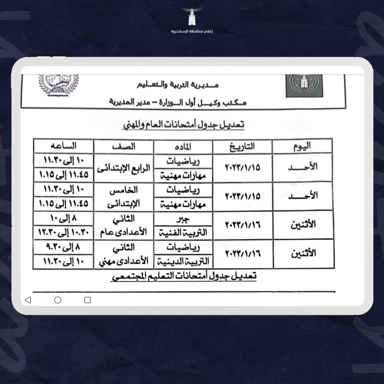 تم تعديل الجدول بحيث يؤدي طلاب الصفين الرابع والخامس الابتدائي امتحان مادتي ( الرياضيات والمهارات المهنية ) يوم الأحد الموافق 15 يناير الجاري في تمام العاشرة صباحًـا ، فيما يؤدي طلاب الصف الثاني الإعدادي عام امتحان الجبر والتربية الفنية يوم الإثنين 16 يناير من الثامنة صباحًـا ، ويؤدي طلاب الصف الثاني الإعدادي مهني امتحان الرياضيات والتربية الدينية يوم 16 يناير في الثامنة صباحًـا.