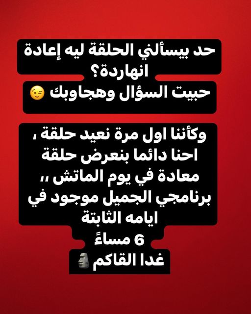 وقالت ياسمين عز عبر صفحتها الشخصية على موقع التواصل الاجتماعي "فيس بوك"، قائلة: "حد بيسالني ليه إعادة انهاردة حبيت السؤال وهجاوبك، وكأننا أول مرة نعيد حلقة احنا دائما بنعرض حلقة كعادة في يوم الماتش برنامجي الجميل موجود في أيامه الثابتة 6 مساءا غدا ألقاكم".
