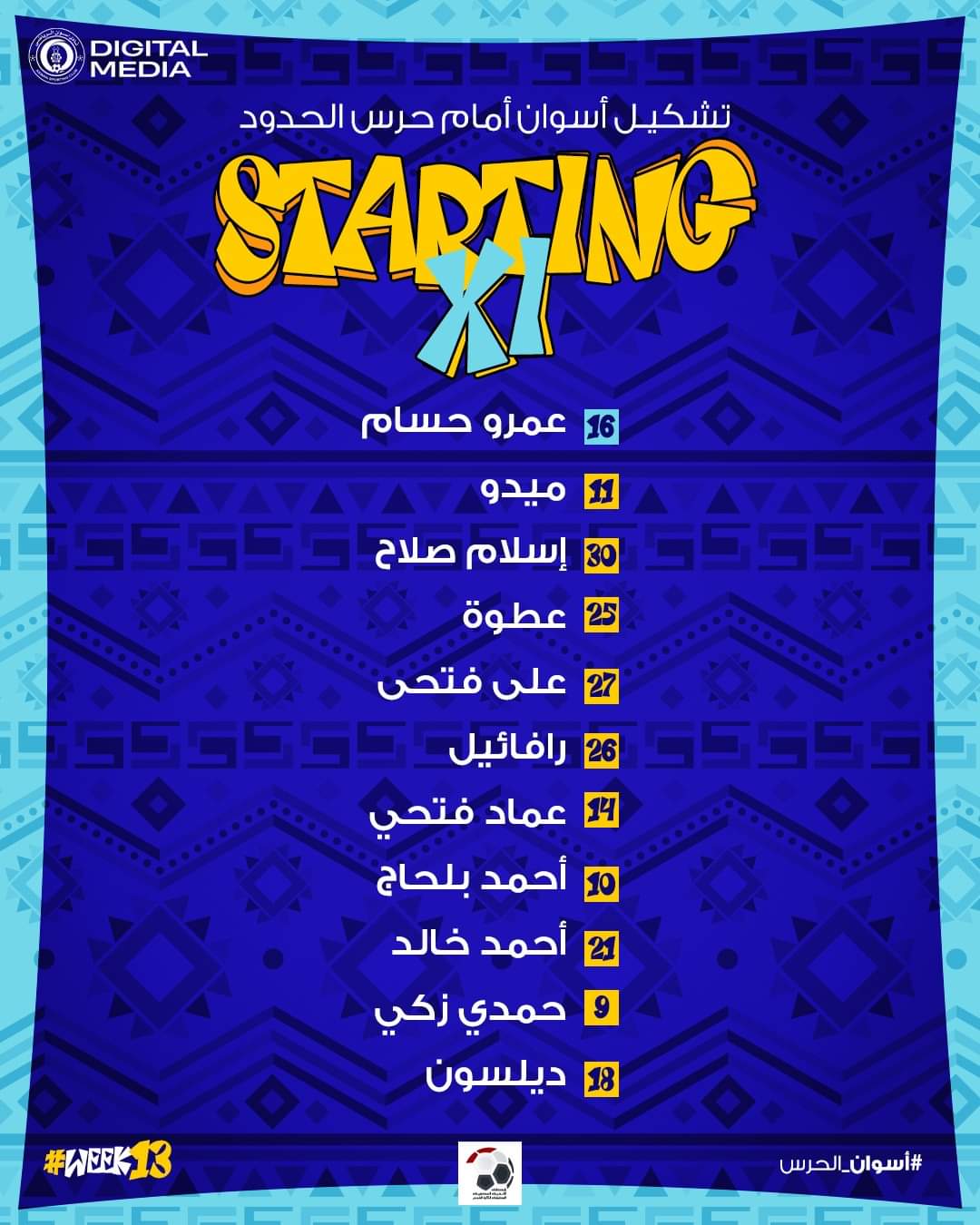 وجاءت تشكيلة أسوان أمام حرس الحدود علي النحو التالي: عمرو حسام في حراسة المرمي، ميدو، إسلام صبحي، عطوة، علي فتحي، رافائيل، عماد فتحي، احمد بلحاج ، احمد خالد، حمدي ذكي، ديلسون