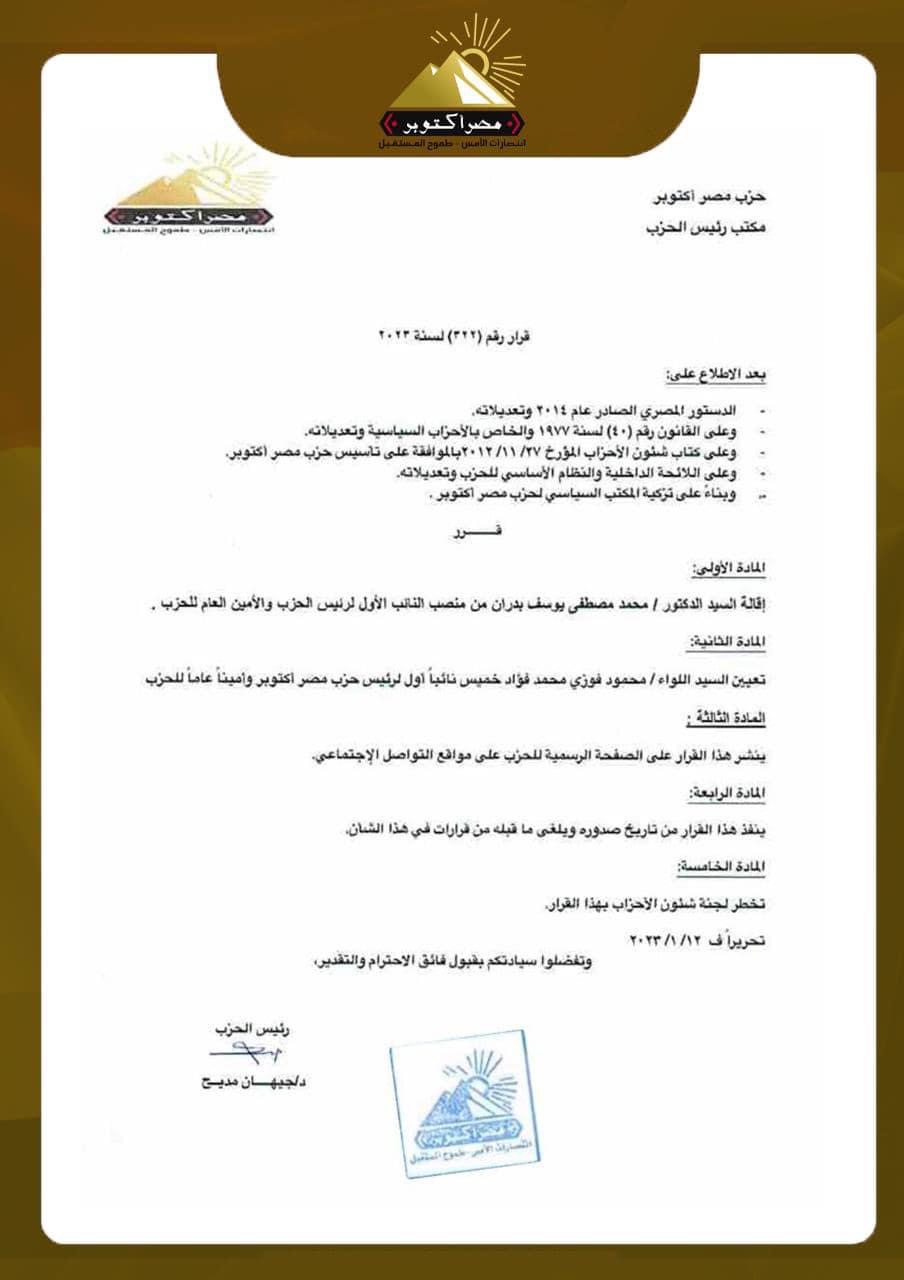 ونص القرار الصادر من رئيس حزب مصر أكتوبر، على إقالة الدكتور محمد مصطفى يوسف بدران من منصب النائب الأول لرئيس الحزب والأمين العام للحزب، وتعيين اللواء محمود فوزي محمد فؤاد خميس نائبًا أول لرئيس حزب مصر أكتوبر وأمينًا عامًا للحزب.
