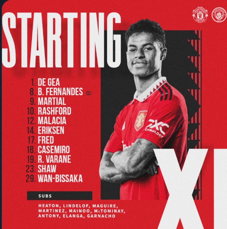 جاءت تشكيلة مانشستر يونايتد كالأتي: دافيد دي خيا في حراسة المرمي، برونو فيرنانديز، وان بيساكا، رافاييل فاران ، ليساندرو مارتينيز ، مالاسيا، كاسيميرو ، فريد، إريكسن، ماركوس راشفورد ، أنتوني مارسيال.
