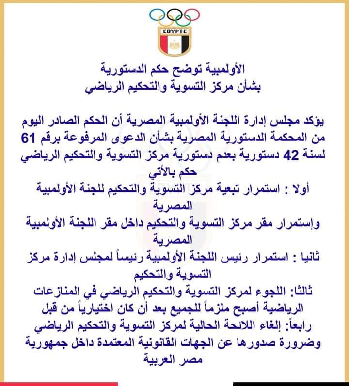 أكد مجلس إدارة اللجنة الأولمبية المصرية أن الحكم الصادر اليوم من المحكمة الدستورية المصرية بشأن الدعوى المرفوعة برقم 61 لسنة 42 دستورية بعدم دستورية مركز التسوية والتحكيم الرياضي حكم بالأتي: