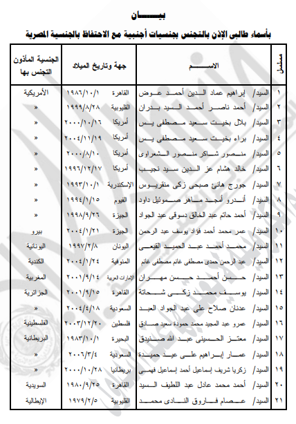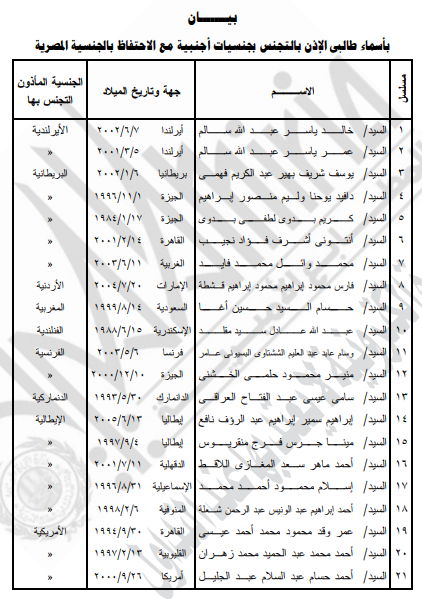 نشرت الجريدة الرسمية صباح اليوم الأحد، قرار وزارة الداخلية بالإذن لـ42 شخصًا بالتجنس بجنسيات أجنبية مرفقة مقابل كل اسم فى الكشوف التالية، صدر القرار بعد الاطلاع على القانون رقم 26 لسنة 1975 الصادر بشأن الجنسية المصرية.