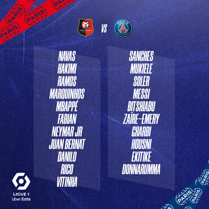 أعلن كريستوف جالتيير المدير الفني لفريق باريس سان جيرمان عن قائمة فريقه لمواجة ستاد رين اليوم وجاءت كالأتي: حراسة المرمى: كيلور نافاس ، سيرجيو ريكو ،جيانلويجي دوناروما، خط الدفاع: أشرف حكيمي ، سيرجيو راموس ، ماركينيوس ، خوان بيرنات ، الشدالي بيتشيابو، نوردي موكيلي، خط الوسط: فابيان رويز ، دانيلو ، فيتور فيريرا، كارلوس سولير ، ريناتو سانشيز ، وارن زائير إيمري ، إسماعيل الغربي، خط الهجوم: كيليان مبابي ، نيمار دا سيلفا ، هوجو إيتيكي ، ليونيل ميسي ، إلياس حسني.