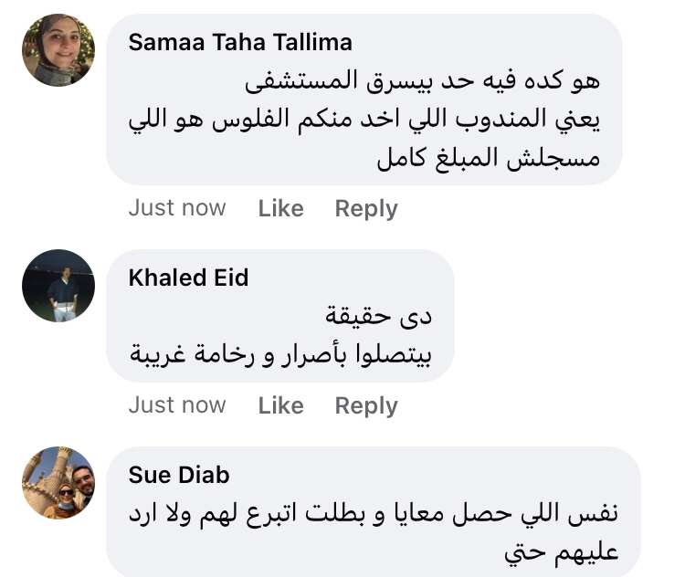 وتابع "فيه وصولات لكن للأسف محتفظناش بيها لأن متوقعناش ان يحصل موقف زي ده. عرفت المستشفى اليوم و المبالغ لأنها كانت على 3 وصولات و محدش رد علينا. و بدل ما يدوروا الفلوس راحت فين بيتصلوا كل شوية بطريقة غريبة جدا و اقفل عليهم يتصلوا تاني و تالت ورا بعض!! السادة المسئولين عن المستشفى واضح انهم مشغولين بحاجات تانية!”.