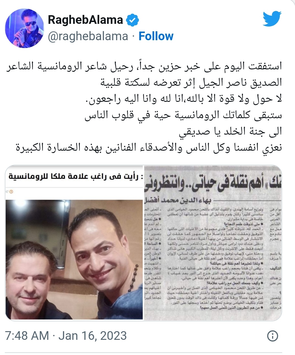نشر راغب علامة عبر صفحته على موقع التدوينات القصيرة "تويتر" مغردا: " استفقت اليوم على خبر حزين جدًا، رحيل شاعر الرومانسية الشاعر الصديق ناصر الجيل إثر تعرضه لسكتة قلبية،لا حول ولا قوة إلا بالله،انا لله وانا اليه راجعون".