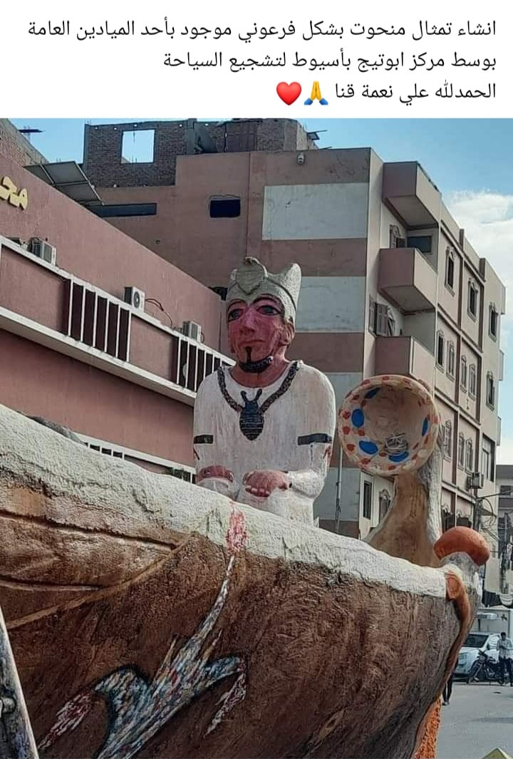 لقي منشور صورة تمثال فرعوني حديث بمركز أبو تيج بمحافظة أسيوط، سخرية كبيرة من المواطنين، حيث وصفه البعض بأنه قبيح جدًا، ووصفوا الفنان بأنه خريج "فنون قبيحة".