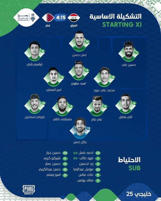 أعلن خيسوس كاساس المدير الفني لمنتخب العراق ، عن تشكيل فريقه الذي سيخوض به مواجهته أمام قطر، في المباراة التي تجمعهما اليوم على ملعب البصرة الدولي، في تمام الساعة الثالثة والربع بتوقيت القاهرة، الرابعة والربع بتوقيت مكة المكرمة، ضمن منافسات نصف النهائي من بطولة كأس الخليج "خليجي 25".