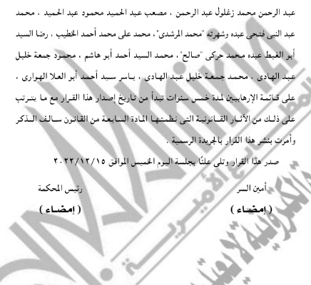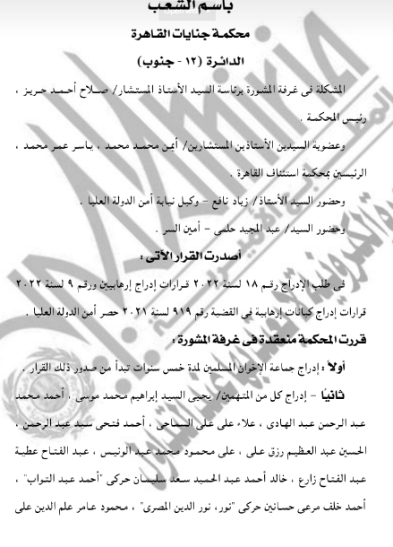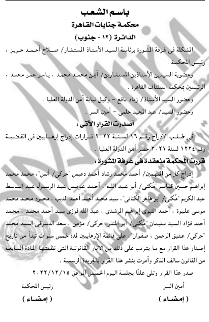كما قررت المحكمة إدراج يحيى موسى وعبد الفتاح زارع و11 آخرين على قوائم الإرهاب لمدة 5 سنوات من تاريخ النشر في الجريدة الرسمية، وإدراج 10 منتهمين في القضية رقم 1224 لسنة 2021 حصر نيابة أمن الدولة العليا.