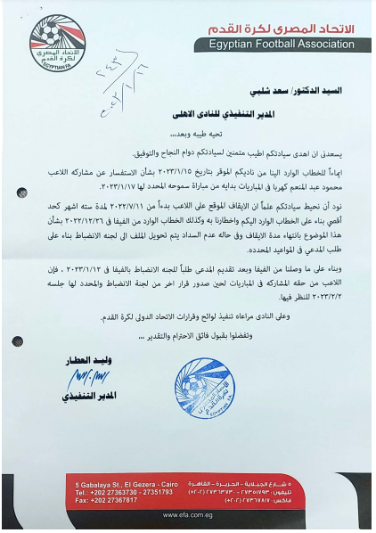 وجاء خطاب الاتحاد المصرى لكرة القدم ردا على خطاب الأهلى الذى أستفسير عن موقف اللاعب من لعب المباراة أم لا لحين صدور قرار جديد من الاتحاد الدولي لكرة القدم.
