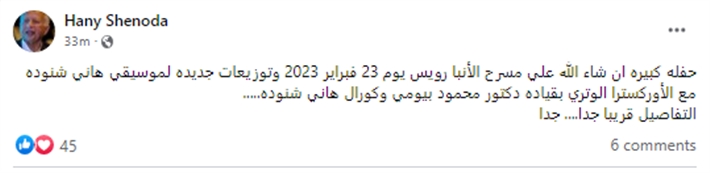 أعلن الموسيقار هاني شنودة عن إقامة حفل جديد خلال الفترة المقبلة، ومن المقرر أن يقام الحفل على مسرح الأنبا رويس يوم 23 فبراير المقبل.