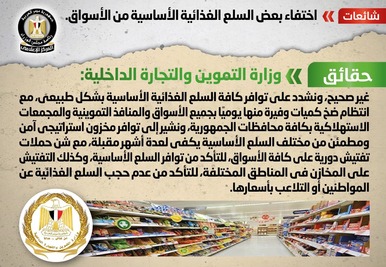 قام المركز الإعلامي لمجلس الوزراء بالتواصل مع وزارة التموين والتجارة الداخلية، والتي نفت تلك الأنباء، مُؤكدةً أنه لا صحة لاختفاء أي من السلع الغذائية الأساسية من الأسواق، مُشددةً على توافر كافة السلع الغذائية الأساسية بشكل طبيعي، مع انتظام ضخ كميات وفيرة منها يوميًا بجميع الأسواق والمنافذ التموينية والمجمعات الاستهلاكية بكافة محافظات الجمهورية، مُشيرةً إلى توافر مخزون استراتيجي آمن ومطمئن من مختلف السلع الأساسية يكفي لعدة أشهر مقبلة، مع شن حملات تفتيش دورية على كافة الأسواق، للتأكد من توافر السلع الأساسية، وكذلك التفتيش على المخازن في المناطق المختلفة، للتأكد من عدم حجب السلع الغذائية عن المواطنين أو التلاعب بأسعارها.