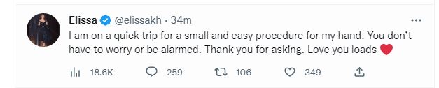 وكتبت إليسا عبر صفحتها على موقع التدوينات القصيرة “تويتر” مغردة قائلة:" هسافر في رحلة سريعة لإجراء عملية صغيرة وسهلة لأيدي لا داعي للقلق جمهورى بحبكم و شكرا على السؤال".