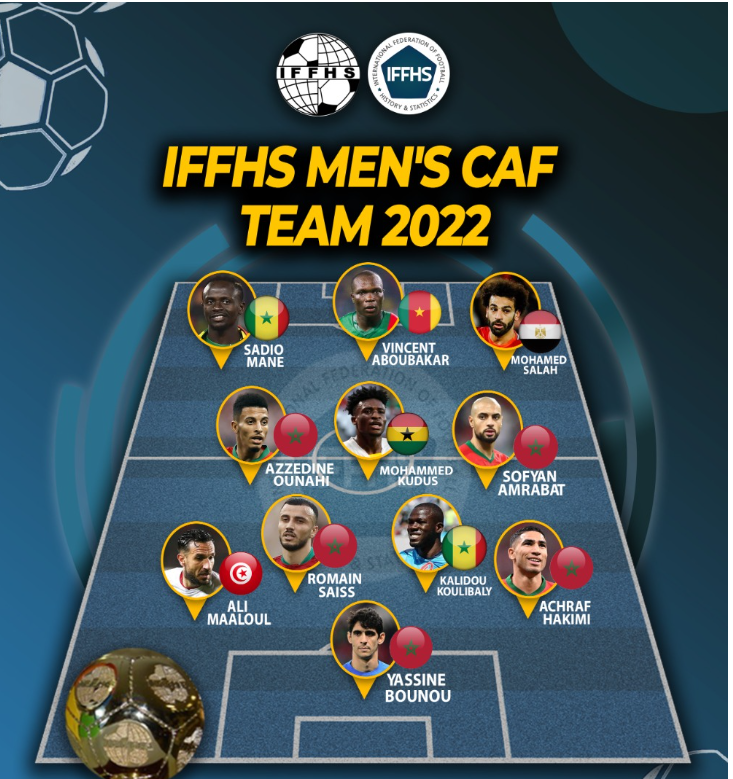 وجاءت التشكيلة المثالية لقارة إفريقيا في عام 2022 كالتالي: حراسة المرمى: ياسين بونو، خط الدفاع: رومان سايس - كاليدو كوليبالي - أشرف حكيمي - علي معلول، خط الوسط: سوفيان أمرابط - محمد قدوس - عز الدين أوناحي، خط الهجوم: محمد صلاح - فينسينت أبو بكر - ساديو ماني.