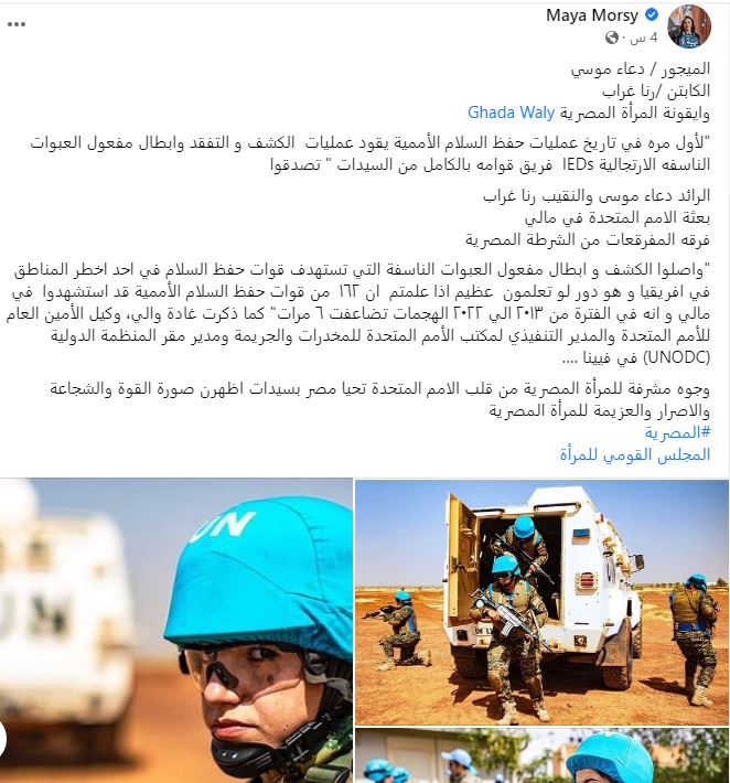 وتابعت "واصلوا الكشف و ابطال مفعول العبوات الناسفة التي تستهدف قوات حفظ السلام في احد اخطر المناطق في افريقيا و هو دور لو تعلمون عظيم اذا علمتم ان 162 من قوات حفظ السلام الأممية قد استشهدوا في مالي و انه في الفترة من 2013 الي 2022 الهجمات تضاعفت 6 مرات" كما ذكرت غادة والي، وكيل الأمين العام للأمم المتحدة والمدير التنفيذي لمكتب الأمم المتحدة للمخدرات والجريمة ومدير مقر المنظمة الدولية (UNODC) في فيينا .. وجوه مشرفة للمرأة المصرية من قلب الامم المتحدة تحيا مصر بسيدات اظهرن صورة القوة والشجاعة والاصرار والعزيمة للمرأة المصرية".