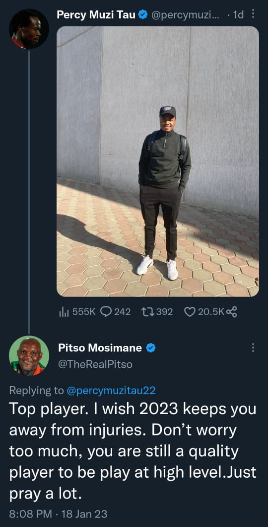 وعلق موسيماني على صورة نشرها بيرسي تاو عبر حسابه على "تويتر"، قائلاً : "لاعب كبير، أتمنى في عام 2023 أن تبتعد عنه الإصابات، ، لا تقلق كثيرًا، فأنت لا تزال لاعبًا مميزًا وتستطيع اللعب في أفضل المستويات، فقط عليك بالصلاة كثيرًا".