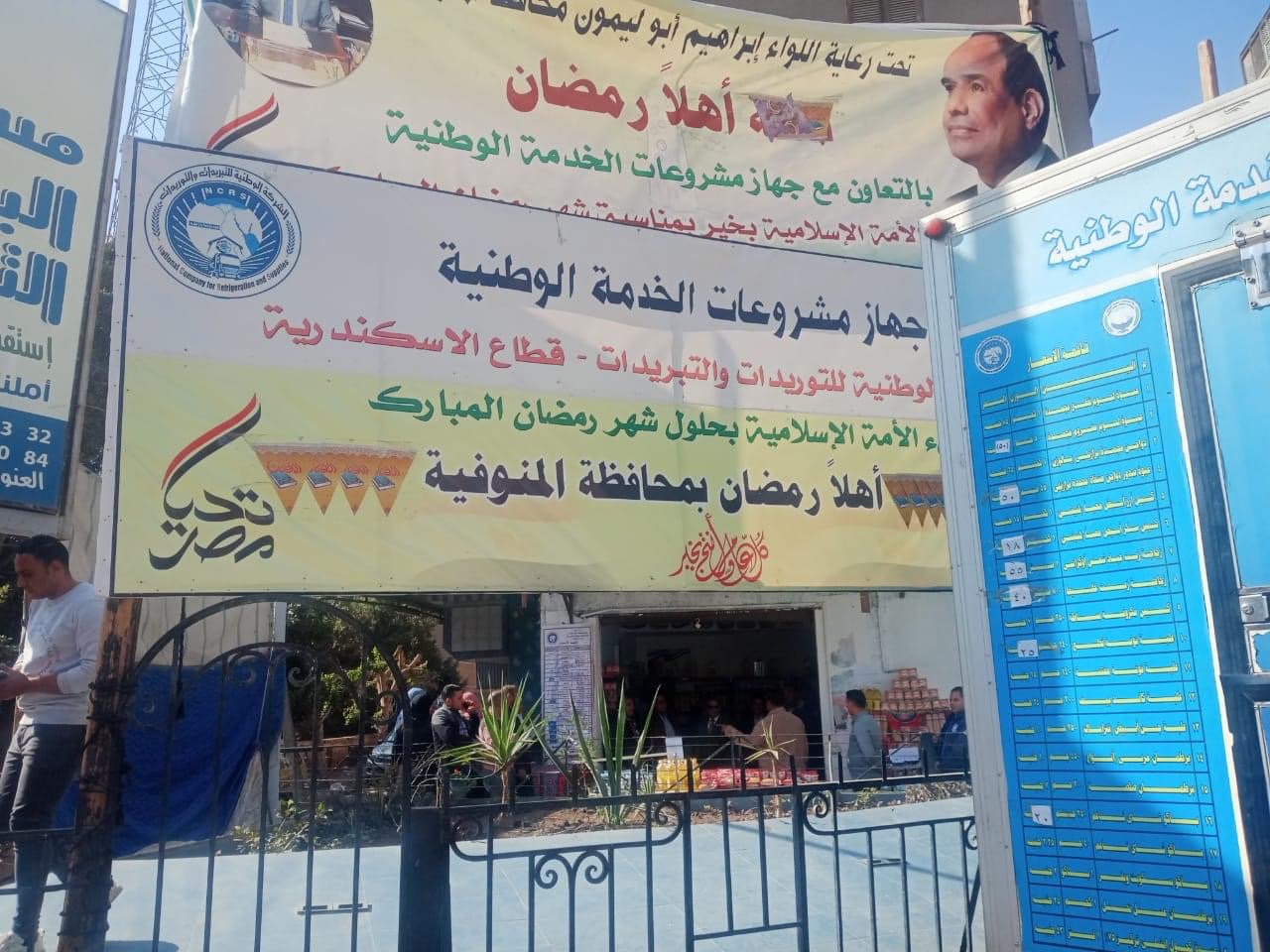 وفي هذا الشأن ، تم إفتتاح منفذ "أهلاً رمضان" لبيع السلع الغذائية والاساسية واللحوم خلف مقر مجلس المدينة ، بحضور مسؤول جهاز مشروعات الخدمة الوطنية، ورئيس الوحدة المحلية لمركز ومدينة منوف، حيث يضم المنفذ العديد من المنتجات ومنها ( الأرز ، مكرونة، زيت، عدس، فول، سمن، فراخ مجمدة، دقيق، ألبان، خضروات، منظفات، معلبات )، وغيرها من المنتجات الضرورية الهامة بهدف تخفيف العبء عن كاهل المواطنين، وتوفير كافة السلع بأسعار مخفضة مقارنة عن مثيلاتها بالأسواق.