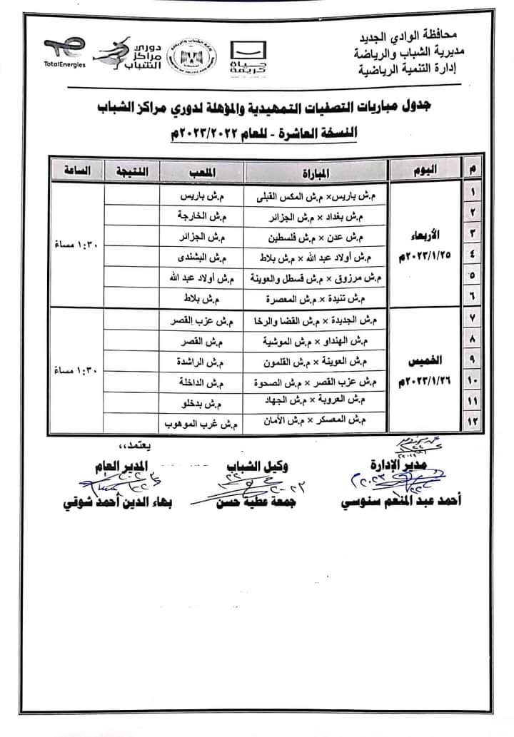 والجدير بالذكر انه قد حضر الاجتماع كلا من السادة وكلاء المديرية للشباب والرياضة ، ومدير التنمية الرياضية ، ومنسقي الدوري ، والمدير التنفيذي للاتحاد المصري لكرة القدم فرع الوادي الجديد ، وممثلين الإدارات الفرعية ، وممثلين عن مراكز الشباب المشاركة بالدوري بالمحافظة.
