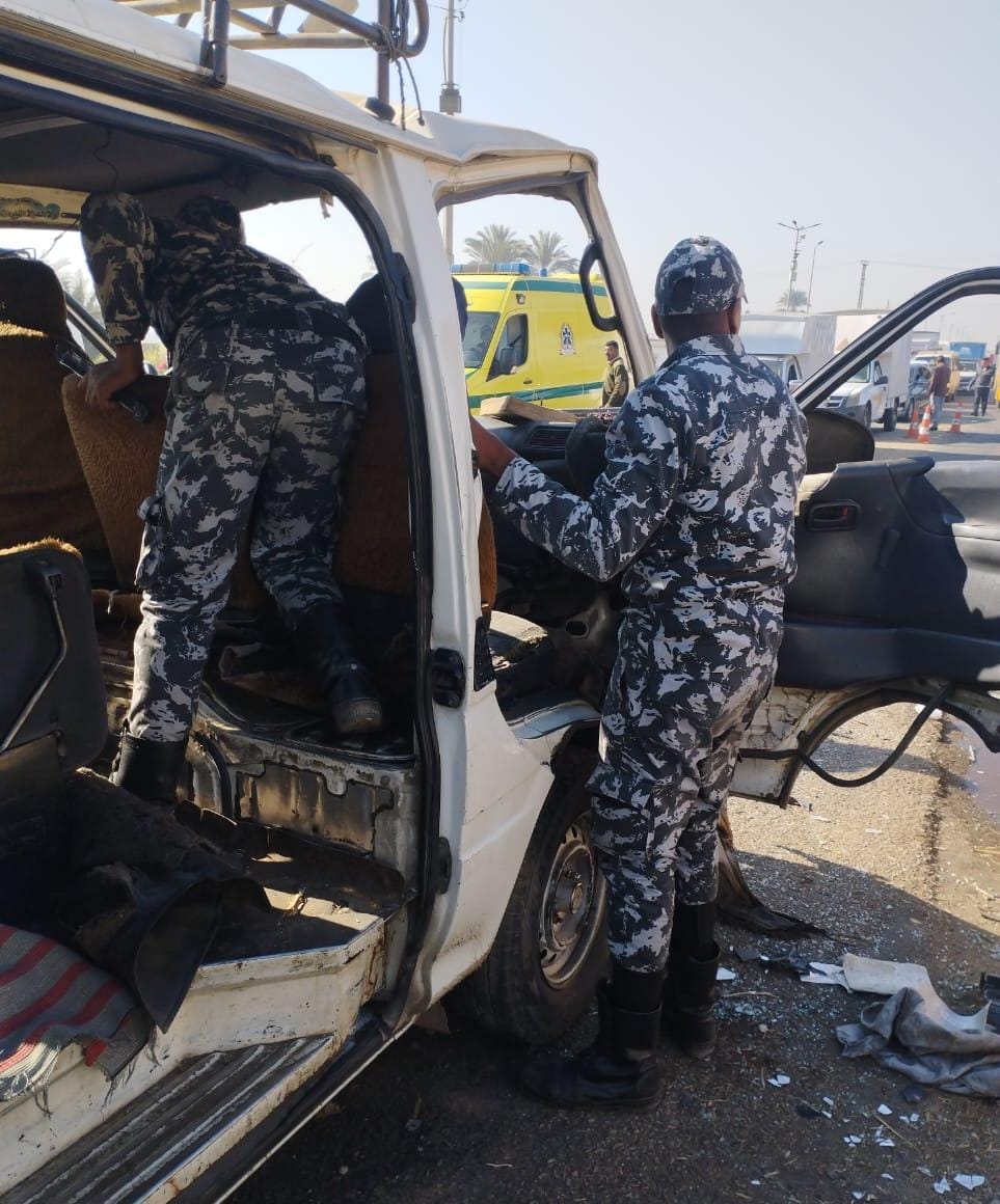 وعلى الفور انتقلت قوات الأمن لموقع الحادث، وفرضت كردون امنى حول منطقة الحادث وتم الدفع بعدد 5 سيارات اسعاف، كما تم انتقلت قوات الحماية المدنية للموقع ، واسفر الحادث عن اصابة كل من شريف .ش .ع،" 26 عاما، اشتباه كسر بالقدم اليمنى، مصطفى ..ع.و"26 عاما، اصابة كسر بالذراع الايمن، حسن .ا.ح" 54 عاما، اصابة كدمه بالصدر جروح بالوجه، جابر .ا.ش" 65 عاما، كدمات بالضلوع، جيهان .ى.م"58 عاما، اصابة كدمات متفرقه بالجسم.