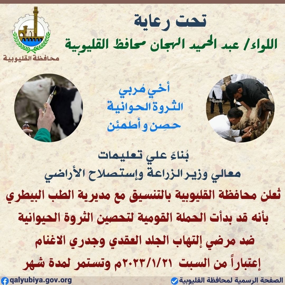 أعلنَّ عبد الحميد الهجان محافظ القليوبية، عن إنطلاق الحملة القومية لتحصين رؤوس الماشية من الأبقار والأغنام والماعز ضد مرض الجلد العقدى وجدري الأغنام، إعتباراً من يوم السبت الموافق 21 يناير 2023 وتستمر لمدة شهر، وذلك بجميع الوحدات البيطرية المنتشرة بمراكز وقرى المحافظة، للحفاظ على الثروة الحيوانية وزيادة إنتاجيتها.