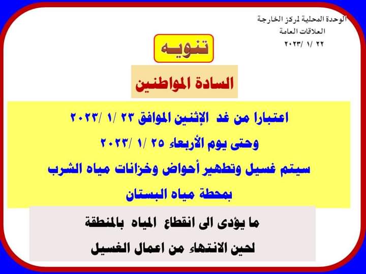 وأوضح جهاد المتولي، رئيس مركز الخارجة، في بيان، اليوم، عبر صفحة المركز على فيس بوك، الاعتذار للمواطنين، نظرا لعمل غسيل وتطهير أحواض وخزانات مياة الشرب ما يستدعى خروج محطة مياه البستان عن الخدمة ويؤدى إلى انقطاع المياه عن الحى، وذلك من اليوم الإثنين وحتى بعد غداً الاربعاء. وطالبهم بتخزين مياه تكفي احتياجاتهم لحين الانتهاء من أعمال الصيانة.