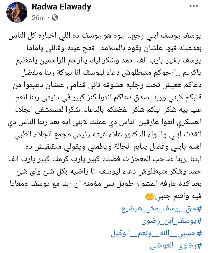 وقالت الكاتبة رضوي العوضي، "يوسف ابني رجع.. ايوه هو يوسف ده اللي اخباره كل الناس بتدعيله فيها علشان يقوم بالسلامه.. فتح عينه وقاللي ياماما يوسف بخير يارب الف حمد وشكر ليك ياارحم الراحمين ياعظيم ياكريم ..ارجوكم متبطلوش دعاء ليوسف انا ببركة ربنا وبفضل دعاكم هعيش تحت رجليه هشوفه تانى قدامي علشان دعيتوا من قلبكم لابني وربنا صدق دعاكم انتوا كنز كبير في دنيتي ربنا انعم عليا بيه شكرا ليكم شكرا لفضلكم بالدعاء..شكرا لمستشفى الجلاء العسكري انتوا عارفين الناس دي عملت لابني ايه بعد ربنا الناس دي انقذت ابني واللواء الدكتور علاء غيته رئيس مجمع الجلاء الطبي اهتم بابني وفضل يتابع الحالة ويطمني ويقولي متقلقيش ده ابننا .ربنا صاحب المعجزات فضلك كبير يارب كرمك كبير يارب الف حمد وشكر متبطلوش دعاء ليوسف انا راضيه بكل شئ واى شئ بعد كده عارفه المشوار طويل بس مؤمنه ان ربنا مع يوسف ومعايا فيه وانتم جنبي".