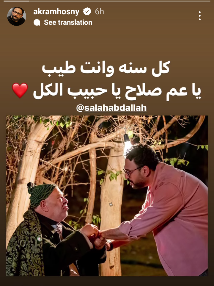وشارك أكرم حسني صورة تجمعه بالفنان صلاح عبد الله عبر حسابه الشخصي بموقع تبادل الصور والفيديوهات انستجرام، من خلال خاصية "ستوري"، وعلق عليها، قائلا: كل سنة وانت طيب يا عم صلاح حبيب الكل".