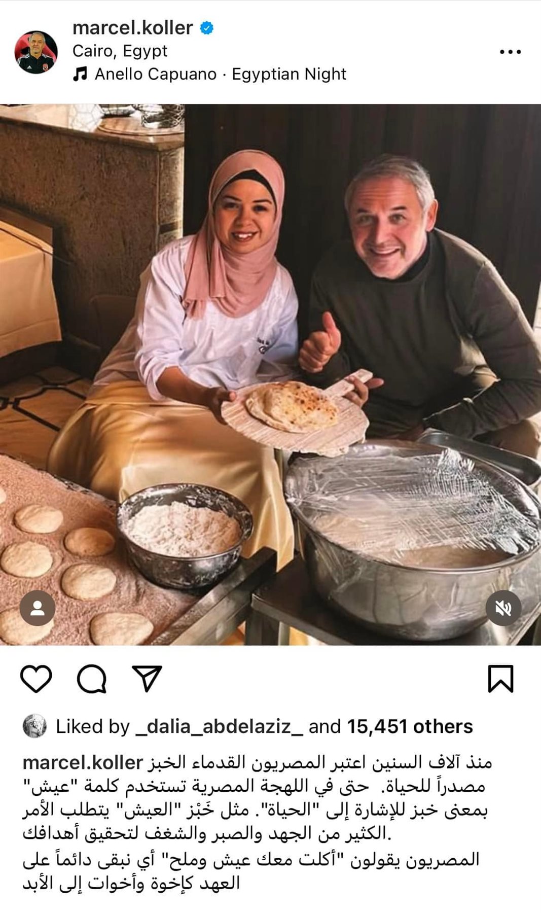 تغنى السويسري مارسيل كولر، المدير الفني لفريق الكرة بالنادي الأهلي، بحضارة وأصالة الشعب المصري، حيث نشر مارسيل كولر على صفحته الشخصية بموقع "انستجرام" صورة له بجوار إحدى السيدات المصريات ترتدي الحجاب وتخبز الخبز على الطريقة المصرية القديمة.