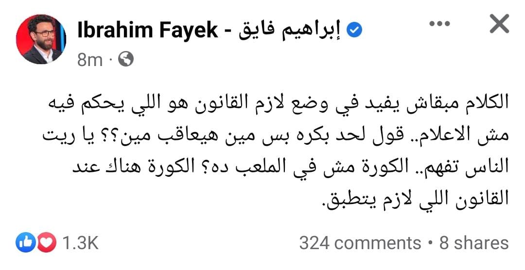 وقال إبراهيم فايق عبر حسابه الشخصي بموقع التواصل الاجتماعي "فيسبوك": "الكلام مبقاش يفيد في وضع لازم القانون هو اللي يحكم فيه مش الاعلام.. قول لحد بكره بس مين هيعاقب مين؟؟ يا ريت الناس تفهم.. الكورة مش في الملعب ده؟ الكورة هناك عند القانون اللي لازم يتطبق".