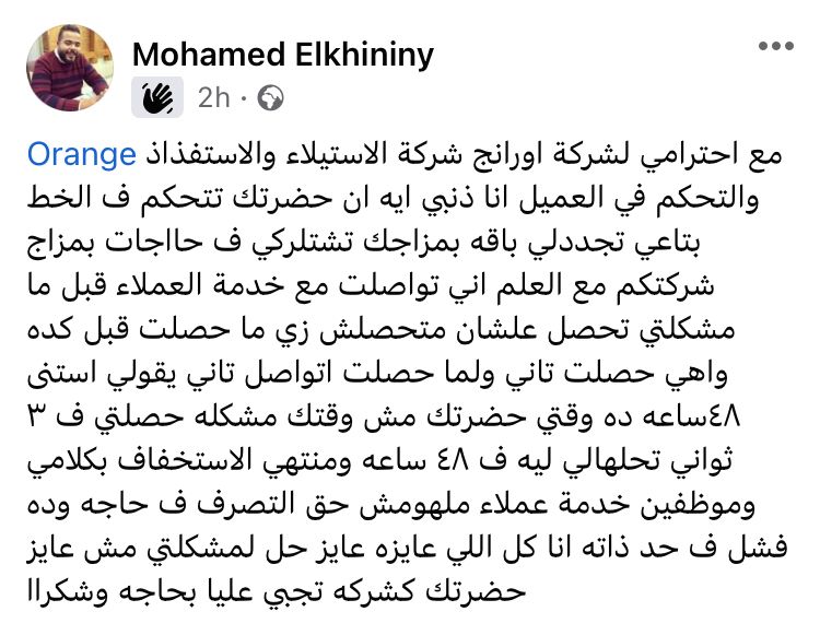 وقال صاحب الشكوي،" مع احترامي لشركة اورانج شركة الاستيلاء والاستفذاذ والتحكم في العميل انا ذنبي ايه ان حضرتك تتحكم ف الخط بتاعي تجددلي باقه بمزاجك تشتركلي ف حاجات بمزاج شركتكم مع العلم اني تواصلت مع خدمة العملاء قبل ما مشكلتي تحصل علشان متحصلش زي ما حصلت قبل كده واهي حصلت تاني ولما حصلت اتواصل تاني يقولي استنى 48 ده وقتي حضرتك مش وقتك مشكله حصلتي ف 3 ثواني تحلهالي ليه ف 48 ساعة ومنتهي الاستخفاف بكلامي وموظفين خدمة عملاء ملهومش حق التصرف ف حاجه وده فشل ف حد ذاته انا كل اللي عايزه عايز حل لمشكلتي مش عايز حضرتك كشركه تجبي عليا بحاجة وشكراا”.
