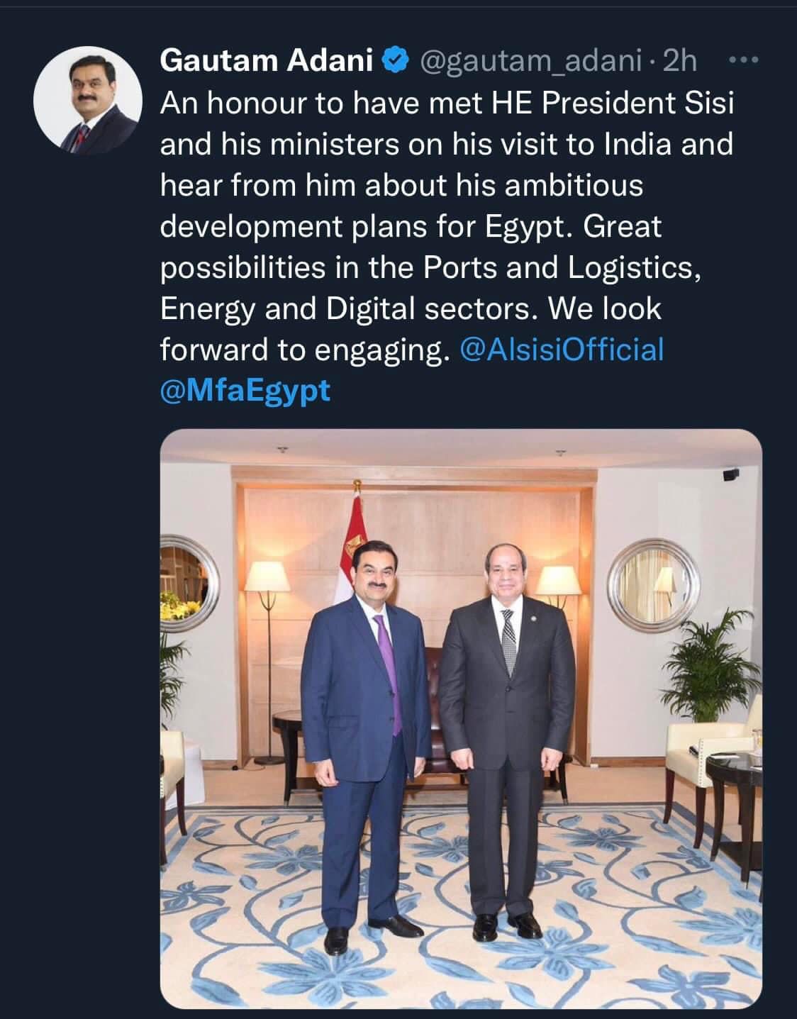 وصرح المتحدث الرسمى باسم رئاسة الجمهورية بأن السيد الرئيس رحب باهتمام مجموعة "أداني" الاقتصادية بالاستثمار في مصر، مؤكداً الاستعداد لتقديم كافة الدعم اللازم للمجموعة ومشروعاتها المستقبلية التي تخطط لإقامتها في مصر، خاصةً من خلال التعاون مع صندوق مصر السيادي المصري، خاصة فيما يتعلق بالمواني فى ضوء ما اصبحت مصر تمتلكه من سلسلة موانيء حديثة علي سواحل المتوسط والبحر الاحمر وخليج السويس.