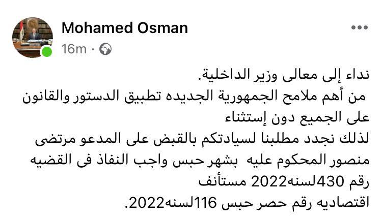 وكتب محمد عثمان المحامى عبر صفحتة الشخصية على موقع التواصل الاجتماعى "فيس بوك": نداء إلى معالى وزير الداخلية.. من أهم ملامح الجمهورية الجديده تطبيق الدستور والقانون على الجميع دون إستثناء.. لذلك نجدد مطلبنا لسيادتكم بالقبض على المدعو مرتضى منصور المحكوم عليه بشهر حبس واجب النفاذ فى القضيه رقم 430 لسنه2022 مستأنف اقتصاديه رقم حصر حبس 116 لسنه 2022.