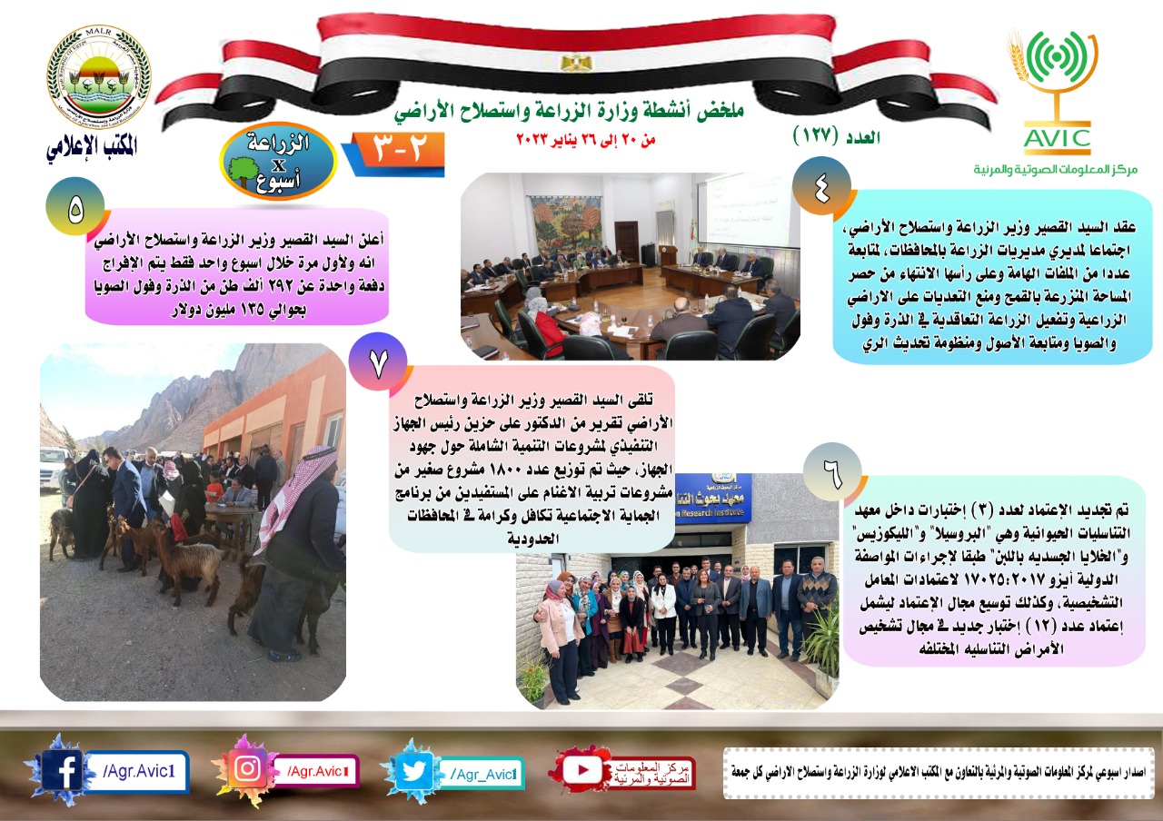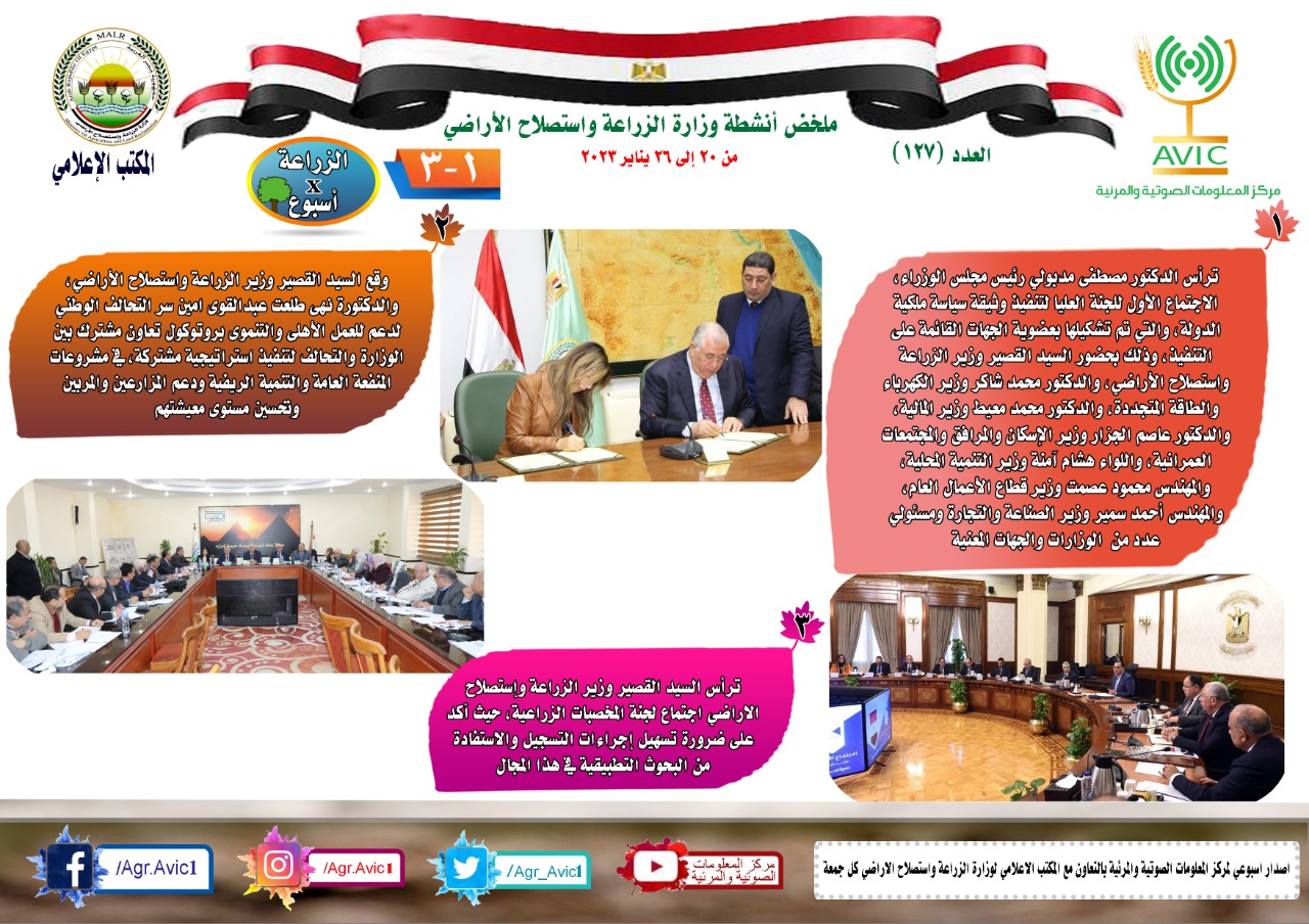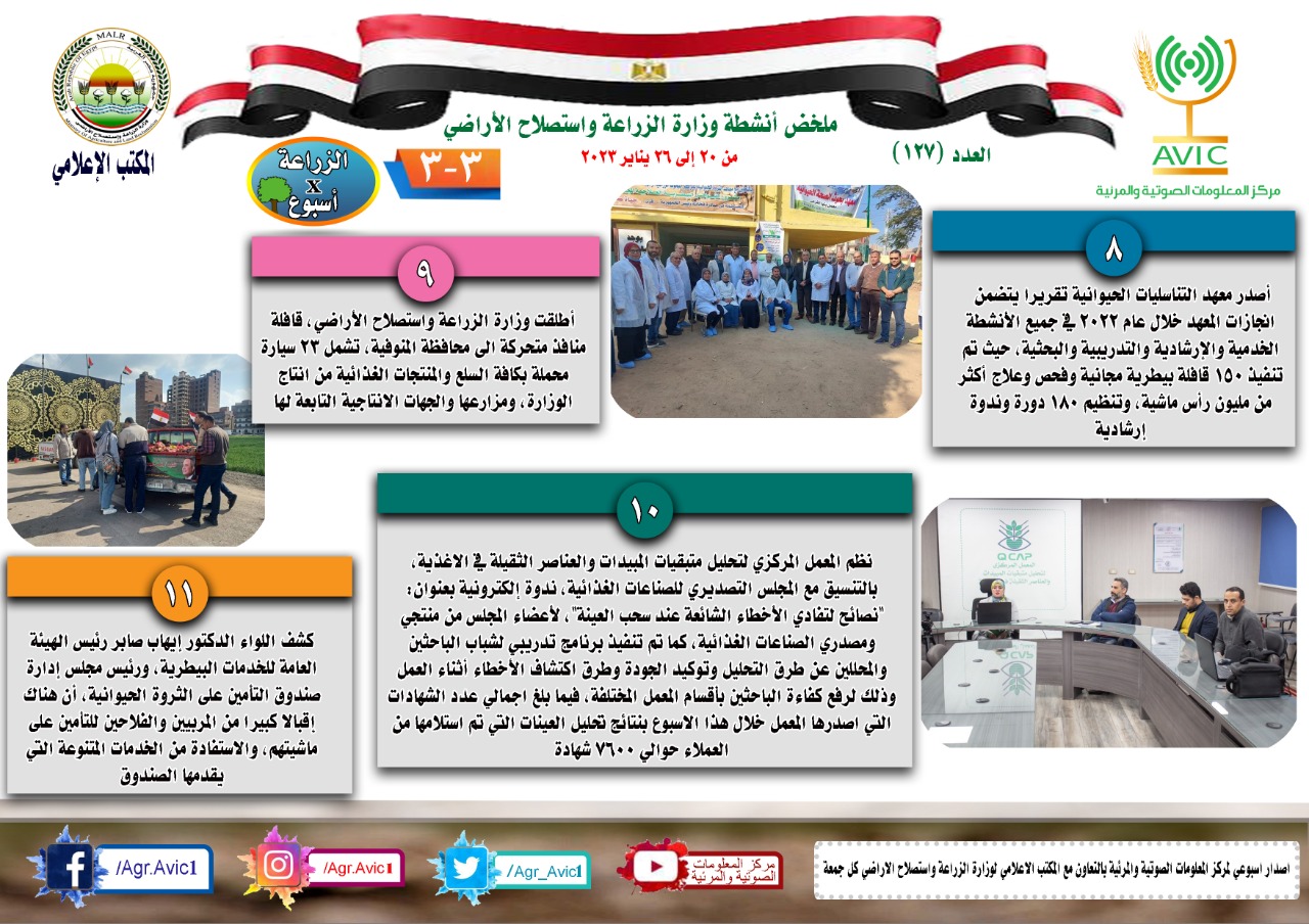 أصدر مركز المعلومات الصوتية والمرئية، التابع لوزارة الزراعة واستصلاح الأراضي، "الانفوجراف الاسبوعي" في نسخته رقم ١٢٧، حول الحصاد الاسبوعي لأهم أنشطة الوزارة، خلال الاسبوع الماضي في الفترة من ٢٠ إلى ٢٦ يناير الجاري، وذلك بالتعاون مع المكتب الاعلامي للوزارة، كما أصدر المركز ايضا ملخصا بالفيديو، حول انشطة الوزارة خلال نفس الفترة.