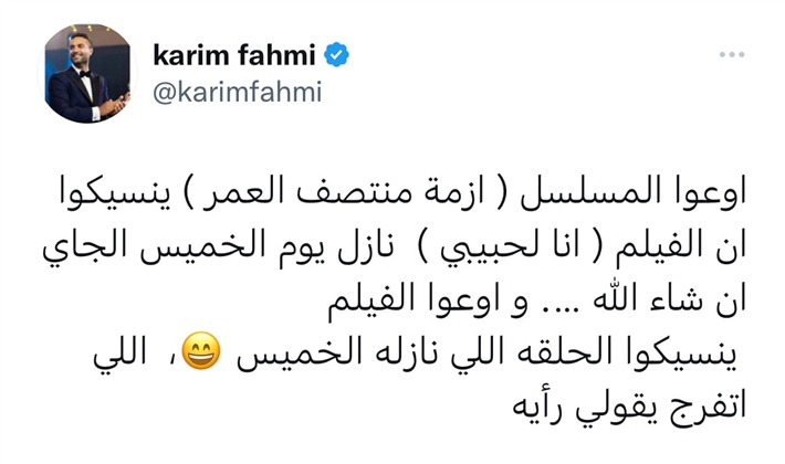 مازح الفنان كريم فهمي جمهوره عبر حسابه الشخصي بموقع التواصل الاجتماعي “تويتر”، وكتب لجمهوره: "اوعوا مسلسل أزمة منتصف العمر ينسيكوا أن فيلم أنا لحبيبي نازل يوم الخميس الجاي ان شاء الله اوعوا الفيلم ينسيكوا الحلقة اللي نازله الخميس".