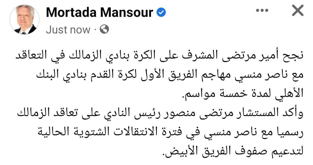 وقال مرتضى منصور عبر حسابه الشخصي بموقع التواصل الاجتماعي "فيسبوك": "نجح أمير مرتضى المشرف على الكرة بنادي الزمالك في التعاقد مع ناصر منسي مهاجم الفريق الأول لكرة القدم بنادي البنك الأهلي لمدة خمسة مواسم، في فترة الانتقالات الشتوية الحالية لتدعيم صفوف الفريق الأبيض.