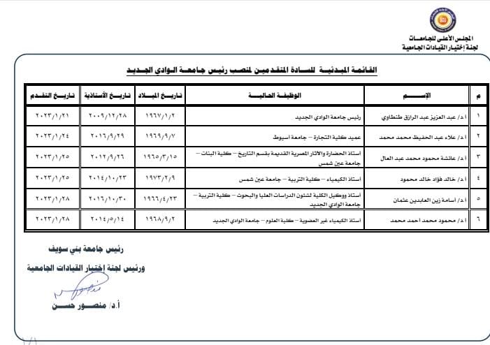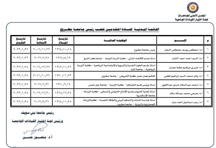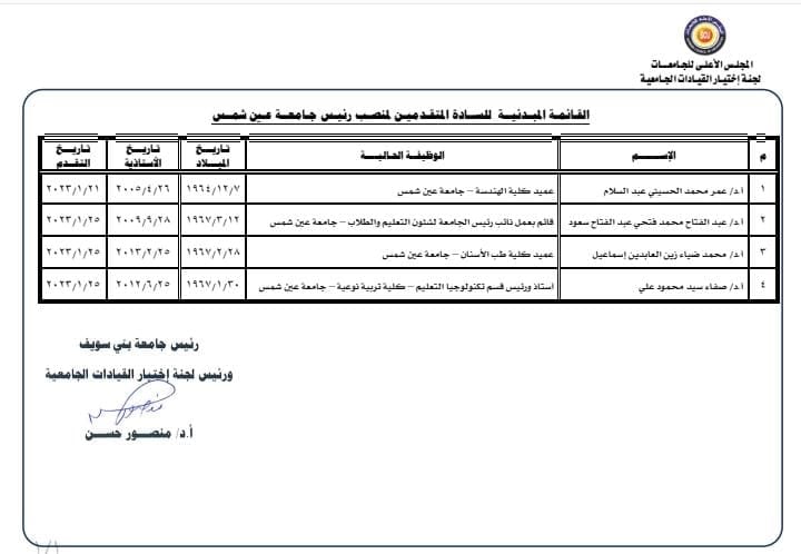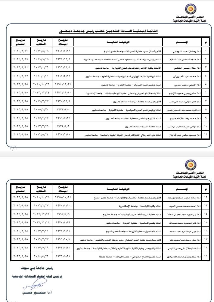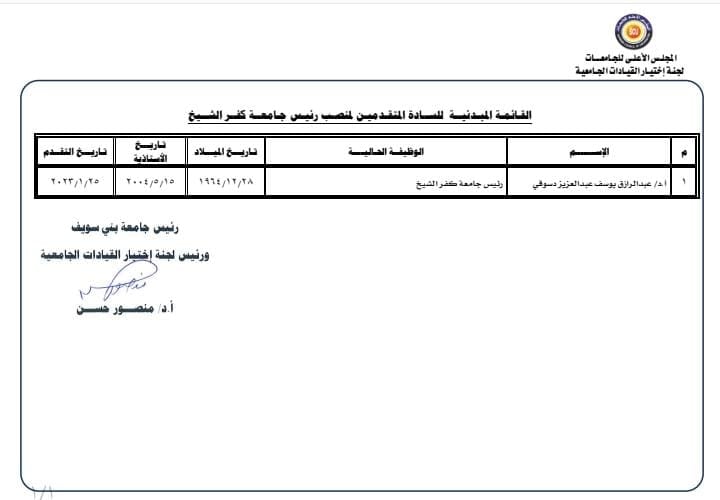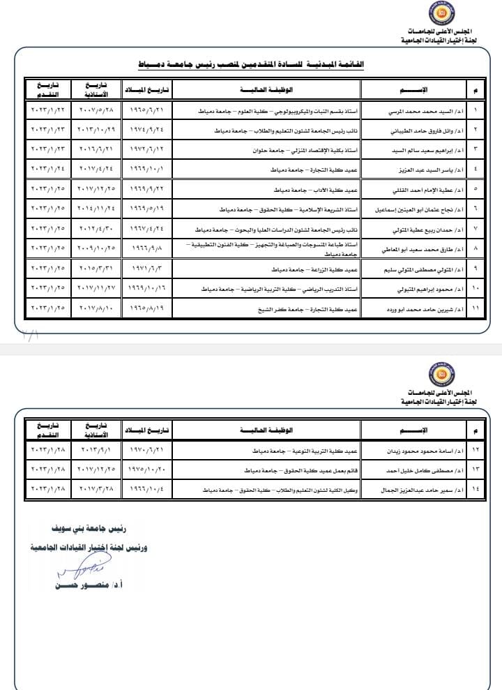 أعلن المجلس الأعلى للجامعات الحكومية برئاسة الدكتور محمد أيمن عاشور وزير التعليم العالي والبحث العلمي، القوائم المبدئية للمتقديمن لشغل منصب رئيس الجامعة لجامعات عـين شمــس - بنهـا - كفـر الشـــيخ - ســـوهـاج - دمنهــور - دميـاط - الـوادي الجـديــد - مطــروح.