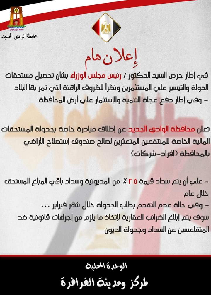مبادرة لجدولة المستحقات المالية الخاصة للمنتفعين المتعثرين في إستصلاح الأراضي بالوادي الجديد