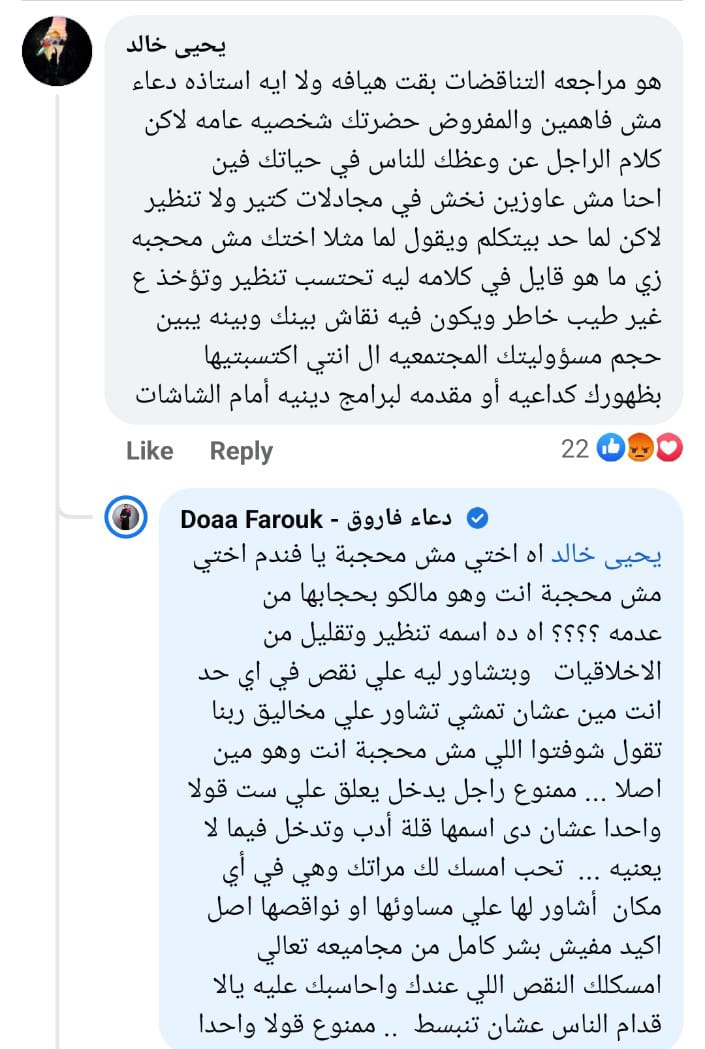 حيث قال أحد متابعي دعاء لها على منشورها “هو مراجعه التناقضات بقت هيافه ولا ايه استاذه دعاء مش فاهمين والمفروض حضرتك شخصيه عامه لاكن كلام الراجل عن وعظك للناس في حياتك فين احنا مش عاوزين نخش في مجادلات كتير ولا تنظير لاكن لما حد بيتكلم ويقول لما مثلا اختك مش محجبه زي ما هو قايل في كلامه ليه تحتسب تنظير وتؤخذ ع غير طيب خاطر ويكون فيه نقاش بينك وبينه يبين حجم مسؤوليتك المجتمعيه ال انتي اكتسبتيها بظهورك كداعيه أو مقدمه لبرامج دينيه أمام الشاشات”.