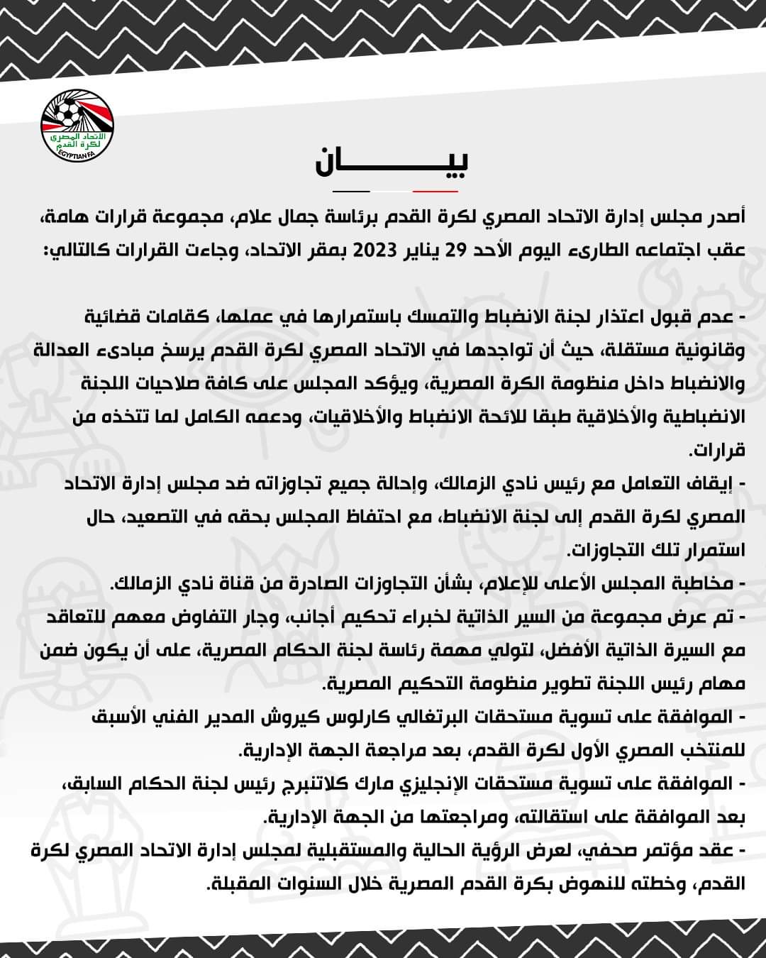 أصدر مجلس إدارة الاتحاد المصري لكرة القدم برئاسة جمال علام، مجموعة قرارات هامة، عقب اجتماعه الطارىء اليوم الأحد 29 يناير 2023 بمقر الاتحاد، وجاءت القرارات كالتالي: