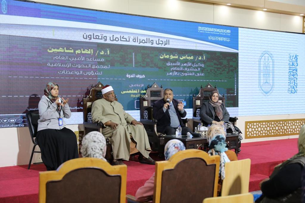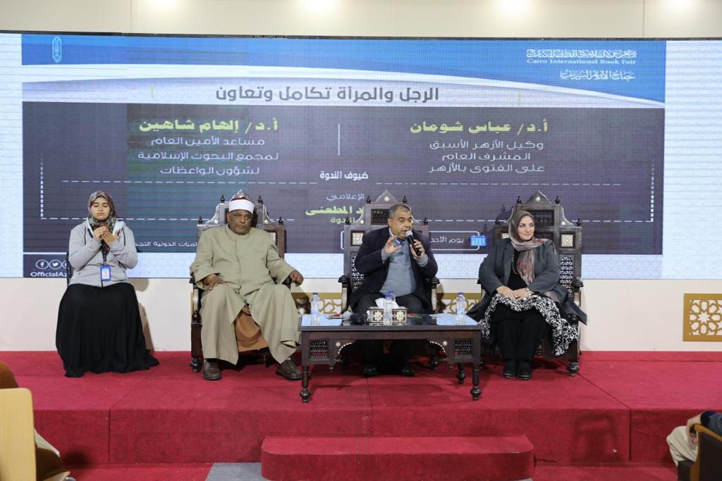 نظم جناح الأزهر الشريف بمعرض القاهرة الدولي للكتاب في نسخته (54)، اليوم الأحد، ندوة تثقيفية حول طبيعة العلاقة بين الرجل والمرأة بعنوان: " الرجل والمرأة تكامل وتعاون "، ناقش الدكتور عباس شومان، وكيل الأزهر الأسبق، والدكتورة إلهام شاهين، مساعد الأمين العام لمجمع البحوث الإسلامية لشؤون الواعظات، وأدار الندوة الآذاعي القدير الأستاذ سعد المطعني.