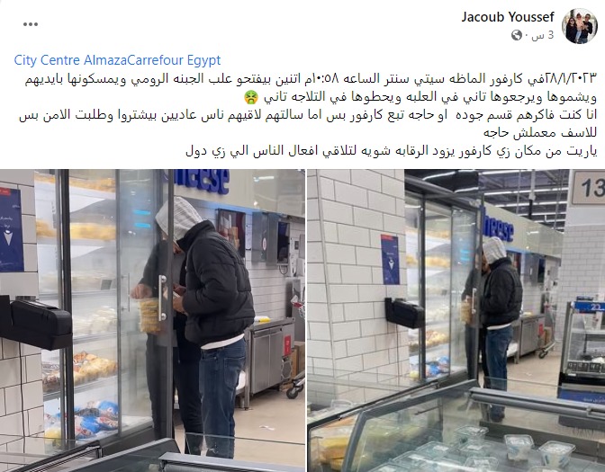 وقال ناشر الواقعة " 28 يناير 2023 في كارفور الماظه سيتي سنتر الساعه 10:58 مساءا اتنين بيفتحو علب الجبنه الرومي ويمسكونها بايديهم ويشموها ويرجعوها تاني في العلبه ويحطوها في التلاجه تاني انا كنت فاكرهم قسم جوده او حاجه تبع كارفور بس اما سالتهم لاقيهم ناس عاديين بيشتروا وطلبت الامن بس للاسف معملش حاجه ..ياريت من مكان زي كارفور يزود الرقابه شويه لتلاقي افعال الناس الي زي دول".
