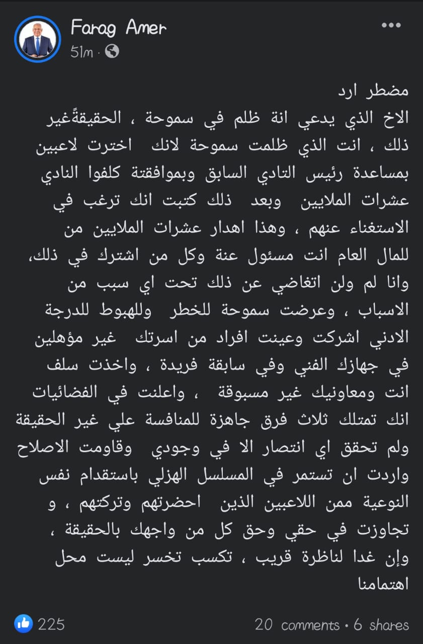 وعلق فرج عامر عبر حسابه الشخصي على موقع التواصل الإجتماعي "فيس بوك"، قائلاً: "مضطر ارد، الاخ الذي يدعي انة ظلم في سموحة ، الحقيقةً غير ذلك ، انت الذي ظلمت سموحة لانك اخترت لاعبين بمساعدة رئيس التادي السابق وبموافقتة كلفوا النادي عشرات الملايين وبعد ذلك كتبت انك ترغب في الاستغناء عنهم ، وهذا اهدار عشرات الملايين من للمال العام انت مسئول عنة وكل من اشترك في ذلك، وانا لم ولن اتغاضي عن ذلك تحت اي سبب من الاسباب".