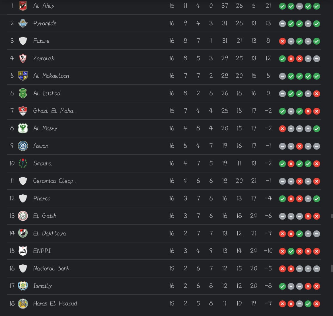 يتربع النادي الأهلى علي عرش صدراة جدول ترتيب الدورى المصرى ، برصيد 37 نقطة، جمعهما بعد ان خاض 15 مباراة ، حقق الفوز في 11 لقاء، وتعادل في 4 ولم يخسر، وسجل لاعبي الفريق الأحمر 26 هدف وتلقت شباكهم 5 أهداف.