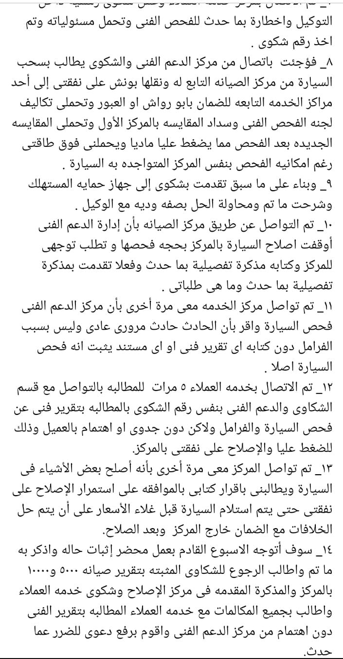 وتابع " تم الاتصال بمركز خدمه العملاء وعمل شكوى رسمية داخل التوكيل واخطارة بما حدث للفحص الفنى وتحمل مسئولياته وتم اخذ رقم شكوى . فؤجئت باتصال من مركز الدعم الفنى والشكوى يطالب بسحب السيارة من مركز الصيانه التابع له ونقلها بونش على نفقتى إلى أحد مراكز الخدمه التابعه للضمان بابو رواش او العبور وتحملى تكاليف لجنه الفحص الفنى وسداد المقايسه بالمركز الأول وتحملى المقايسه الجديده بعد الفحص مما يضغط عليا ماديا ويحملنى فوق طاقتى رغم امكانيه الفحص بنفس المركز المتواجده به السيارة ..وبناء على ما سبق تقدمت بشكوى إلى جهاز حمايه المستهلك وشرحت ما تم ومحاولة الحل بصفه وديه مع الوكيل .