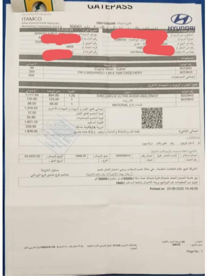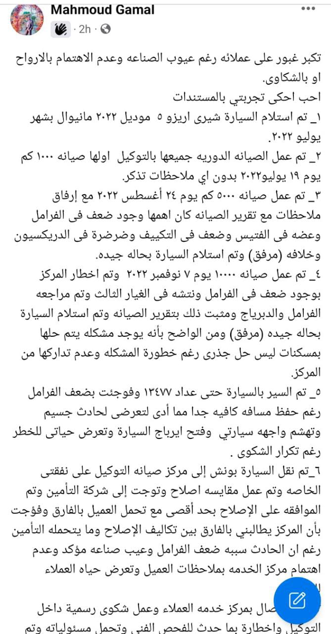 وقال صاحب الواقعة" تكبر غبور على عملائه رغم عيوب الصناعه وعدم الاهتمام بالارواح او بالشكاوى أحب احكى تجربتي بالمستندات تم استلام السيارة شيرى اريزو 5 موديل 2022 مانيوال بشهر يوليو 2022و تم عمل الصيانه الدوريه جميعها بالتوكيل اولها صيانه 1000 كم يوم 19 يوليو2022 بدون اي ملاحظات تذكر وتم عمل صيانه 5000 كم يوم 24 أغسطس 2022 مع إرفاق ملاحظات مع تقرير الصيانه كان اهمها وجود ضعف فى الفرامل وعضه فى الفتيس وضعف فى التكييف وضرضرة فى الدريكسيون وخلافه (مرفق) وتم استلام السيارة بحاله جيدة".