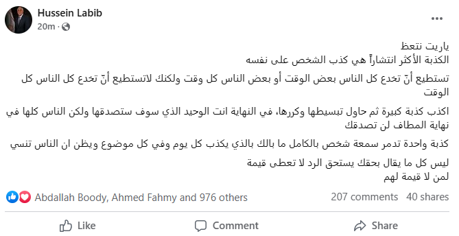 وأوضح حسين لبيب عبر صفحته الرسمية بموقع "فيس بوك"، "ياريت نتعظ، الكذبة الأكثر انتشاراً هي كذب الشخص على نفسه، تستطيع أنّ تخدع كل الناس بعض الوقت أو بعض الناس كل وقت ولكنك لاتستطيع أنّ تخدع كل الناس كل الوقت، اكذب كذبة كبيرة ثم حاول تبسيطها وكررها، في النهاية انت الوحيد الذي سوف ستصدقها ولكن الناس كلها في نهاية المطاف لن تصدقك ، كذبة واحدة تدمر سمعة شخص بالكامل ما بالك بالذي يكذب كل يوم وفي كل موضوع ويظن ان الناس تنسي، ليس كل ما يقال بحقك يستحق الرد لا تعطى قيمة ، لمن لا قيمة لهم".