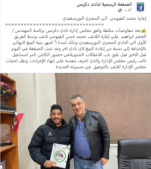 أعلن نادي دكرنس الرياضي رسمياً إعارة محمد حسن الفيومي لاعب الوسط بالفريق، الى نادي المصري البورسعيدي ذلك لمدة 6 أشهر بنية البيع النهائي بالإضافة إلي نسبة من إعادة البيع لاي نادي اخر.